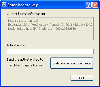 The Enter License Key dialog provides information about your current license, such as its length and expiration date, and allows you to enter a new activation key. You can open the Enter License Key dialog by choosing the Help > Enter License Key command.