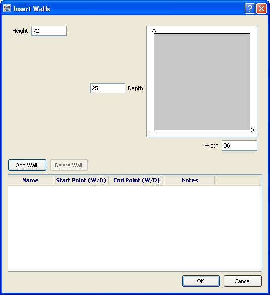 To insert a wall, click Add Wall and enter a name for the wall, the starting and ending values for Width and Depth, and any information about the wall that you want to remember. A red line indicating the wall appears on the diagram.