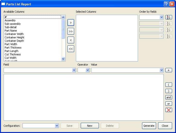 - The column selection area. Select the columns you want to include in the report, and click the > button. To include all the columns, click >>.