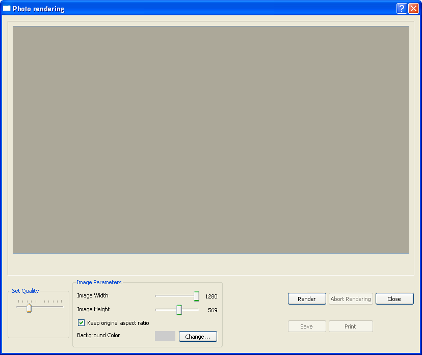 - The action area. This area contains buttons that allow you to render the object, stop the rendering, close the Photo Rendering dialog, save the rendered image to your computer, and print the rendered image.